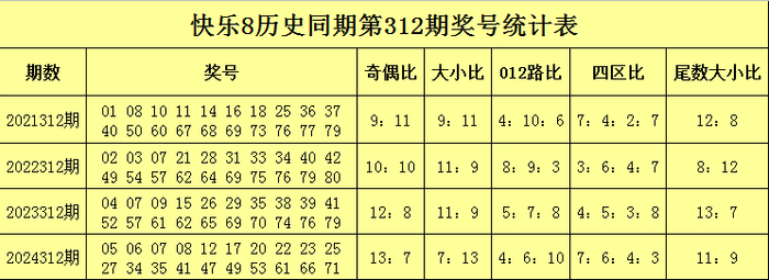 在历年同期开奖中,奖号总比例为44:36,大小总比例为38:42,012路总比例为21:32:27,四区总比例为21:21:13:25,和值出现范围在629-908之间,跨度出现范围在66-78区段。