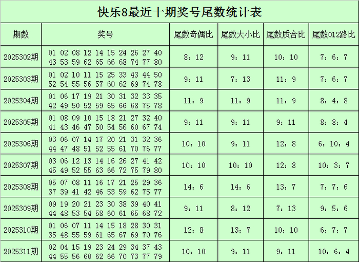 福彩快乐8第2025311期开奖回顾:02 04 15 19 23 24 29 34 37 43 44 55 56 60 62 66 70 73 77 79,其中奖号尾数奇偶比为10:10,尾数012路比为10:6:4,尾数大小比为9:11,尾数质合比为9:11。