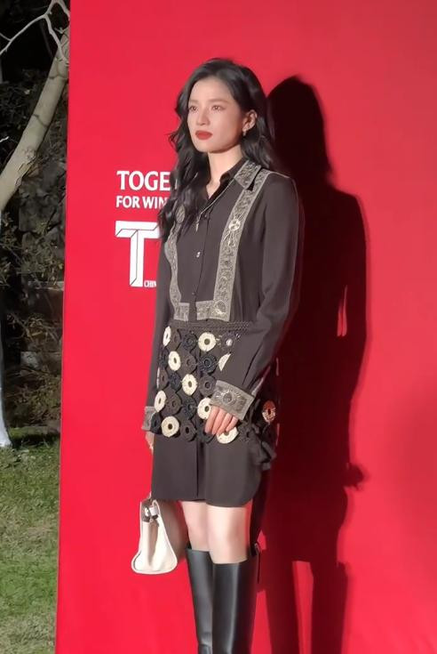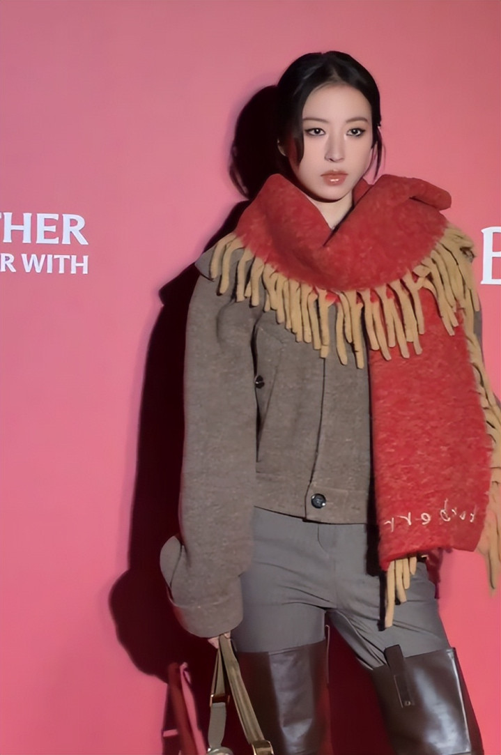 穿着灰色的毛呢上衣、长筒靴本应展现华丽优雅的气质。