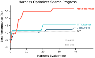 Harness Optimizer 搜索进度对比。Meta-Harness(红色曲线)在极少的 Harness Evaluations 下快速达到最高性能,显著优于 OpenEvolve、TTTDiscover、ACE 等方法,展现了完整执行轨迹带来的效率优势。