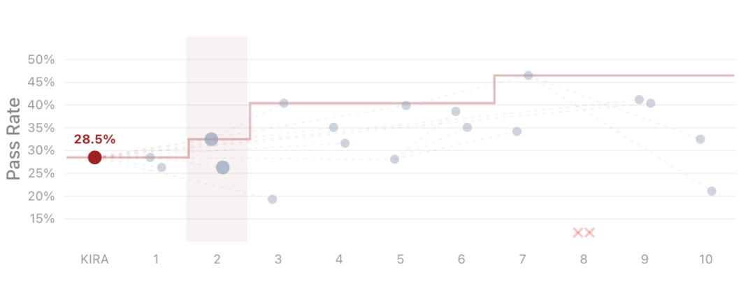 从Terminus-KIRA基线的28.5%起步,到第7轮迭代就涨到了46.5%。