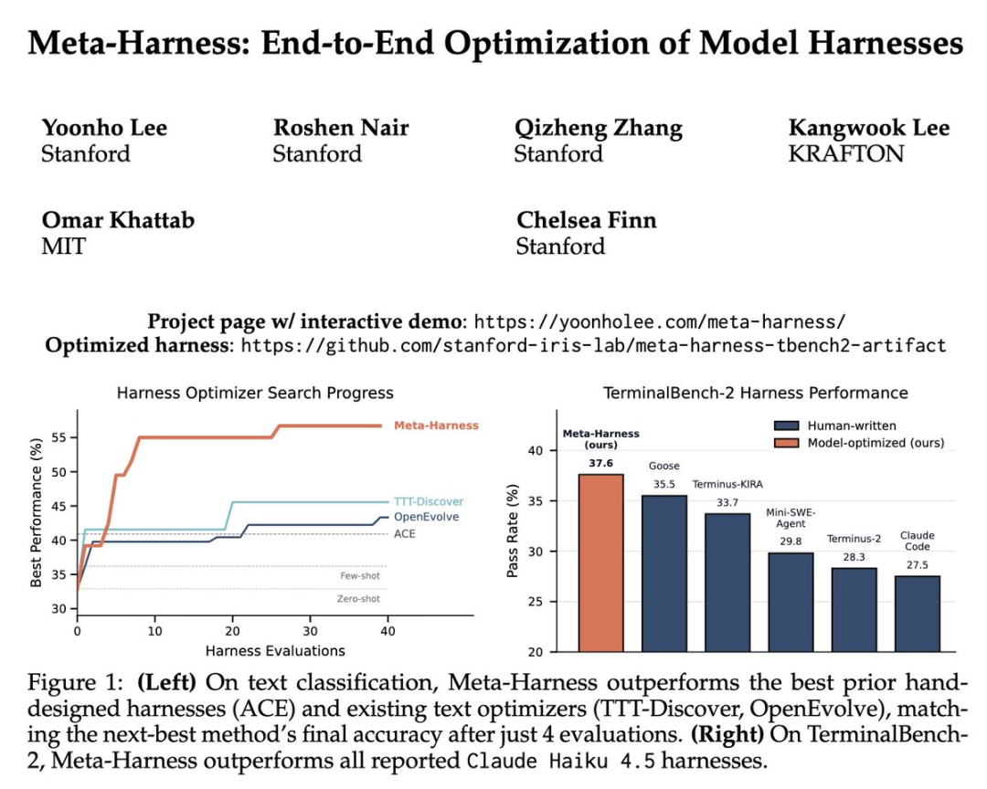 Meta-Harness 端到端优化结果总结。(左)在文本分类任务上,Meta-Harness 以极少的评估次数就超越了 ACE、OpenEvolve 等先前方法;(右)在 TerminalBench-2 基准上,Meta-Harness 优化的 Claude Haiku 4.5 harness 达到 37.6% 通过率,超越所有已报道的 Haiku 4.5 harness(包括 Goose 35.5% 和 Terminus-KIRA 33.7%),实现小模型登顶。