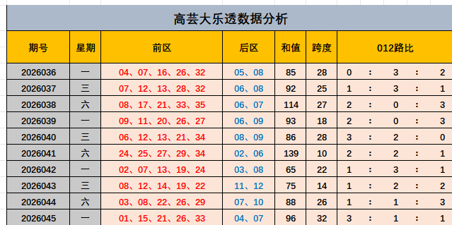 大乐透2026045期开奖奖号前区01,15,21,26,33。后区04,07,前区和值96,跨度32,012路比3:1:1